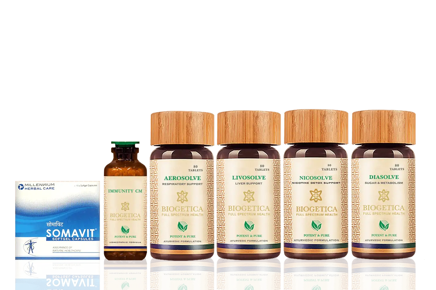 The Core immunity boost kit with lung health, sugar balance and nicosolve formula is essential for today. It contains Ayurvedic, supplement and homeopathic formulas, essential to boosting immunity and health. Some of these formulas are now on national advisories given to people by the Indian and Chinese Governments. This particular kit also contains Diasolve - sugar balance formula with nicosolve for lung rejuvenation and smoking cessation. ...Read More
