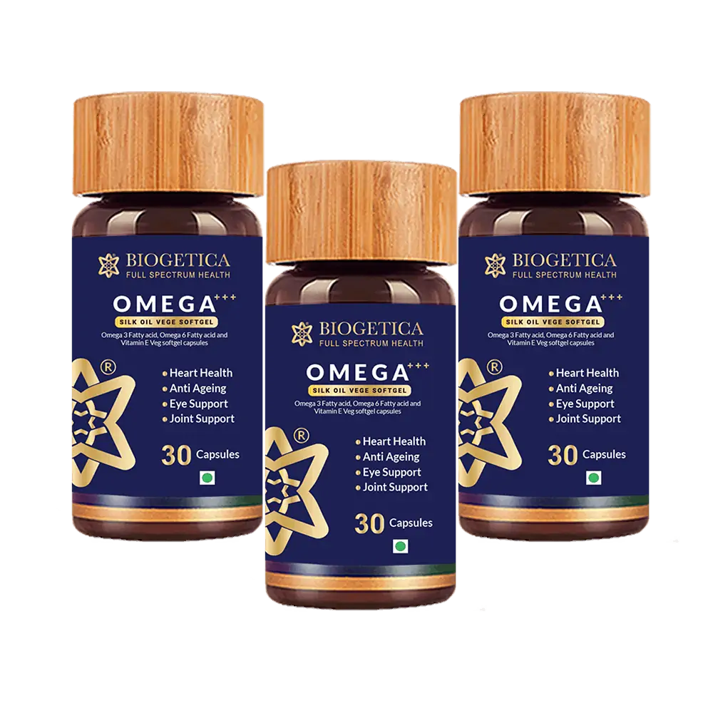Omega-3 fatty acids are essential nutrients you get from food or supplements that help build and maintain a healthy body. These fatty acids are vital for optimizing joint movement, brain function, skin, and heart health. Hence the functions of Omega-3 fatty acids are essential to you living a long and healthy life. Biogetica’s Omega-3 fatty acids are a class apart from anything else in the market today owing to their unique nature and assimilation. Since it is usually derived from animal sources, vegans and vegetarians cannot get enough Omega-3 from their diet and consequently have low levels of this vital nutrient. Biogetica’s Omega +++ Silk Oil Capsules are all-natural, 100% plant-based, and gluten-free. They are formulated with high alpha-linolenic acid (Ala), extracted from the silkworm chrysalis (Bombyx Mori) through a natural mechanical process without any solvents, and are ideal for vegans and vegetarians. In comparison with other silk oils, this capsule contains almost double the alpha-linolenic acid, the most important component of Omega-3, which makes it an ideal ingredient to add to your diet. Omega+++ Silk Oil Capsules are potentially believed to: