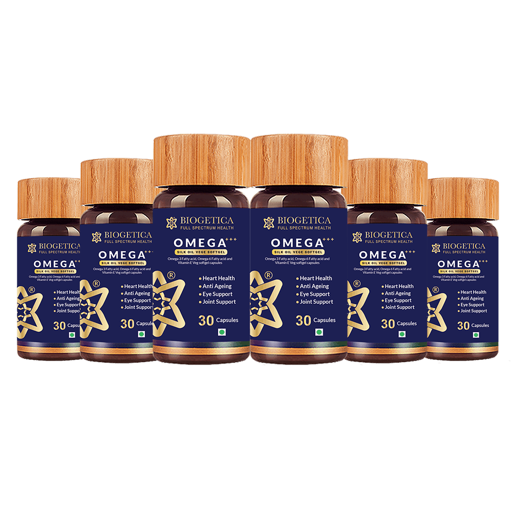 Omega-3 fatty acids are essential nutrients you get from food or supplements that help build and maintain a healthy body. These fatty acids are vital for optimizing joint movement, brain function, skin, and heart health. Hence the functions of Omega-3 fatty acids are essential to you living a long and healthy life. Biogetica’s Omega-3 fatty acids are a class apart from anything else in the market today owing to their unique nature and assimilation. Since it is usually derived from animal sources, vegans and vegetarians cannot get enough Omega-3 from their diet and consequently have low levels of this vital nutrient. Biogetica’s Omega +++ Silk Oil Capsules are all-natural, 100% plant-based, and gluten-free. They are formulated with high alpha-linolenic acid (Ala), extracted from the silkworm chrysalis (Bombyx Mori) through a natural mechanical process without any solvents, and are ideal for vegans and vegetarians. In comparison with other silk oils, this capsule contains almost double the alpha-linolenic acid, the most important component of Omega-3, which makes it an ideal ingredient to add to your diet. Omega+++ Silk Oil Capsules are potentially believed to: