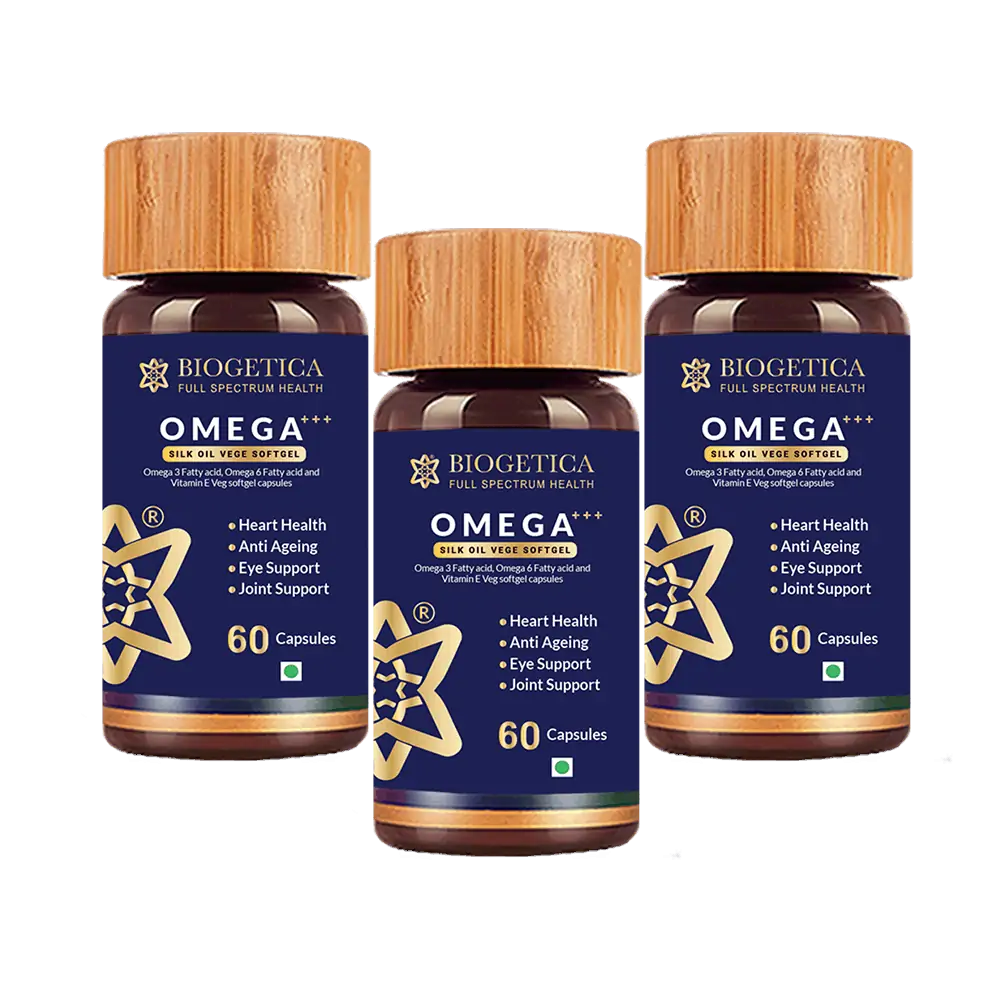 Omega-3 fatty acids are essential nutrients you get from food or supplements that help build and maintain a healthy body. These fatty acids are vital for optimizing joint movement, brain function, skin, and heart health. Hence the functions of Omega-3 fatty acids are essential to you living a long and healthy life. Biogetica’s Omega-3 fatty acids are a class apart from anything else in the market today owing to their unique nature and assimilation. Since it is usually derived from animal sources, vegans and vegetarians cannot get enough Omega-3 from their diet and consequently have low levels of this vital nutrient. Biogetica’s Omega +++ Silk Oil Capsules are all-natural, 100% plant-based, and gluten-free. They are formulated with high alpha-linolenic acid (Ala), extracted from the silkworm chrysalis (Bombyx Mori) through a natural mechanical process without any solvents, and are ideal for vegans and vegetarians. In comparison with other silk oils, this capsule contains almost double the alpha-linolenic acid, the most important component of Omega-3, which makes it an ideal ingredient to add to your diet. Omega+++ Silk Oil Capsules are potentially believed to: