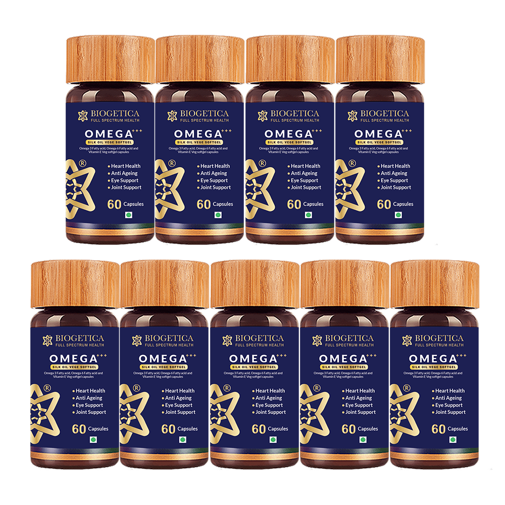 Omega-3 fatty acids are essential nutrients you get from food or supplements that help build and maintain a healthy body. These fatty acids are vital for optimizing joint movement, brain function, skin, and heart health. Hence the functions of Omega-3 fatty acids are essential to you living a long and healthy life. Biogetica’s Omega-3 fatty acids are a class apart from anything else in the market today owing to their unique nature and assimilation. Since it is usually derived from animal sources, vegans and vegetarians cannot get enough Omega-3 from their diet and consequently have low levels of this vital nutrient. Biogetica’s Omega +++ Silk Oil Capsules are all-natural, 100% plant-based, and gluten-free. They are formulated with high alpha-linolenic acid (Ala), extracted from the silkworm chrysalis (Bombyx Mori) through a natural mechanical process without any solvents, and are ideal for vegans and vegetarians. In comparison with other silk oils, this capsule contains almost double the alpha-linolenic acid, the most important component of Omega-3, which makes it an ideal ingredient to add to your diet. Omega+++ Silk Oil Capsules are potentially believed to: