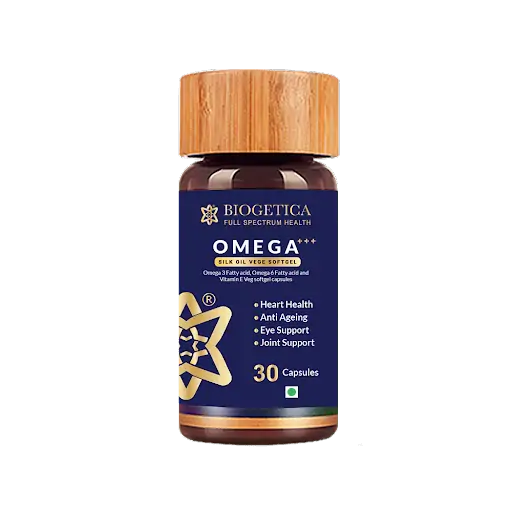 Omega-3 fatty acids are essential nutrients you get from food or supplements that help build and maintain a healthy body. These fatty acids are vital for optimizing joint movement, brain function, skin, and heart health. Hence the functions of Omega-3 fatty acids are essential to you living a long and healthy life. Biogetica’s Omega-3 fatty acids are a class apart from anything else in the market today owing to their unique nature and assimilation. Since it is usually derived from animal sources, vegans and vegetarians cannot get enough Omega-3 from their diet and consequently have low levels of this vital nutrient. Biogetica’s Omega +++ Silk Oil Capsules are all-natural, 100% plant-based, and gluten-free. They are formulated with high alpha-linolenic acid (Ala), extracted from the silkworm chrysalis (Bombyx Mori) through a natural mechanical process without any solvents, and are ideal for vegans and vegetarians. In comparison with other silk oils, this capsule contains almost double the alpha-linolenic acid, the most important component of Omega-3, which makes it an ideal ingredient to add to your diet. Omega+++ Silk Oil Capsules are potentially believed to: