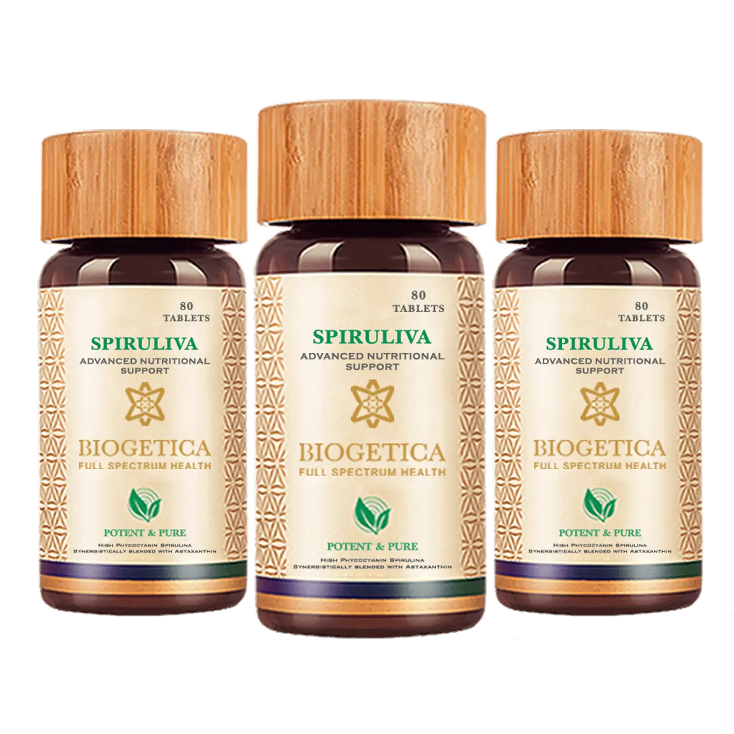 SpiruLiva is a synergistic blend of pure organic spirulina with astaxanthin. Both of these natural ingredients are nutrient dense, potent, free radical scavengers, and singlet oxygen extinguishers, enabling total body health right at the cellular level, especially since astaxanthin has shown to cross the blood-brain and blood-retina barrier.